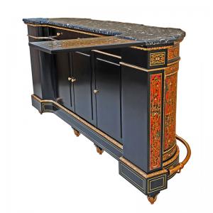 Napoleon III-style Boulle bar counter with brass, "shell", and mother of pearl inlay. Bronzes gilded in 24 kt gold. Protective elements in 24kt gilt brass. Marble countertop.