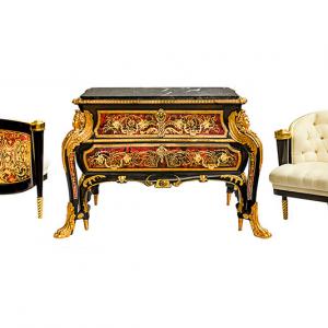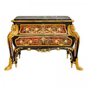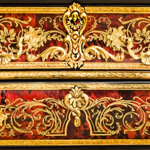 Copy of commode (chest of drawers) attributed to Andrè-Charles Boulle. Walnut and ebony veneer, with brass and "shell" inlay, 24kt gilded bronze, and marble top. The original is exhibited at the Metropolitan Museum in New York.