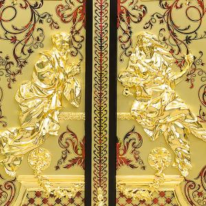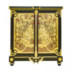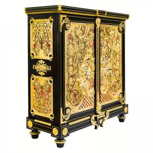 Copy of cabinet attributed to André Charles Boulle and his workshop with 24kt gilded bronze mounts. Brass and "shell" inlay. Inlaid in contre partie. The figures of Aspasia and Socrates stand out, surrounded by medallions, the first of which depicts Louis XIV.