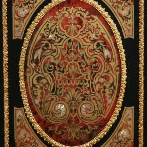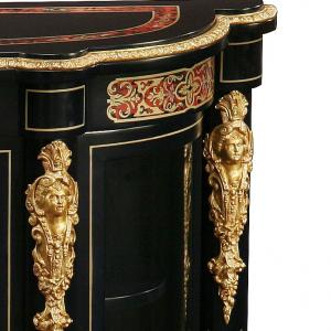 Napoleon III-style Boulle sideboard with three doors. Brass and "shell" inlay with mother of pearl inserts. Cast bronze ornamentation.