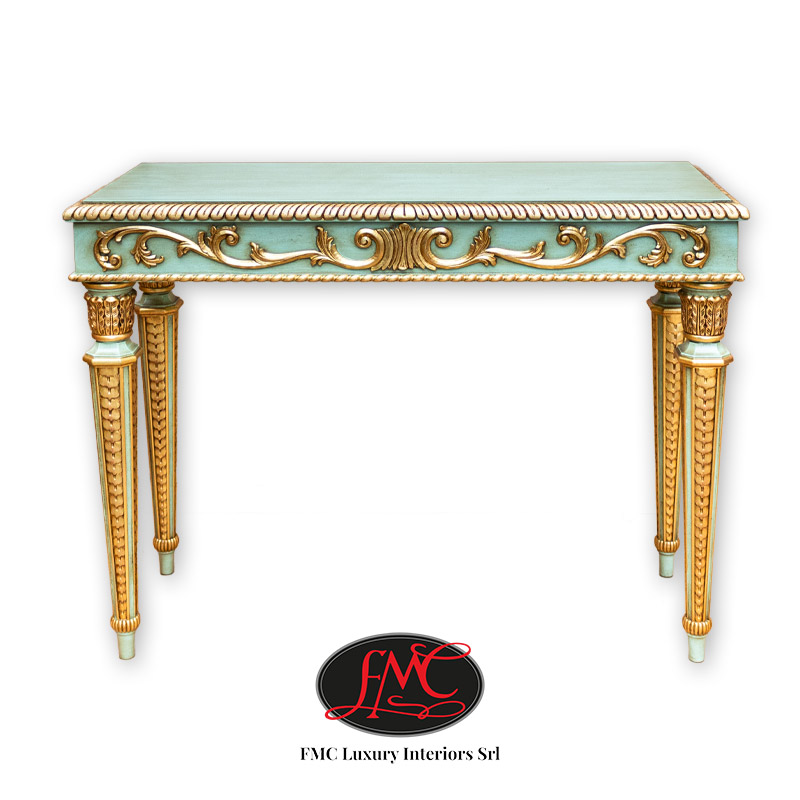 Carved wooden console table, briar top, gold leaf details.